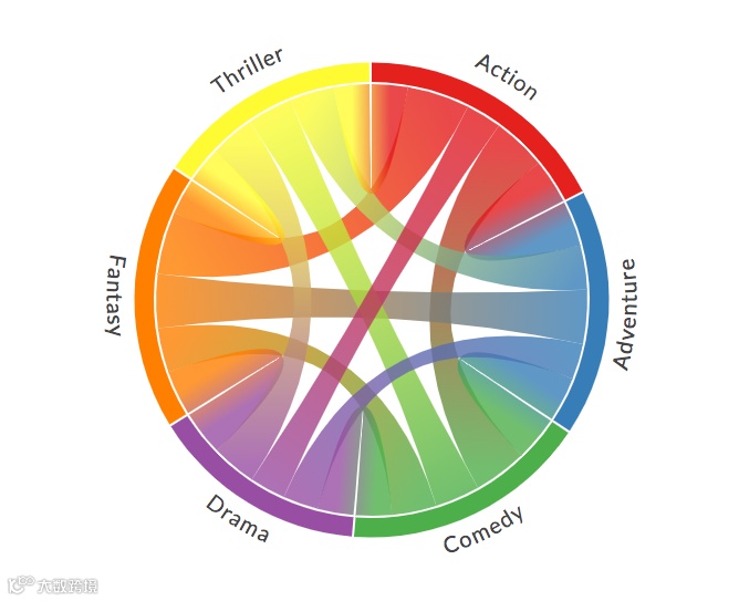 在弧线图中,节点沿单个轴显示,节点间通过圆弧线进行连接。