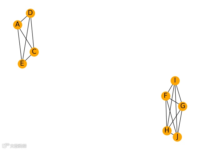 nx.draw(G, with_labels=True, node_color='orange', node_size=400, edge_color='black', linewidths=1, font_size=15)