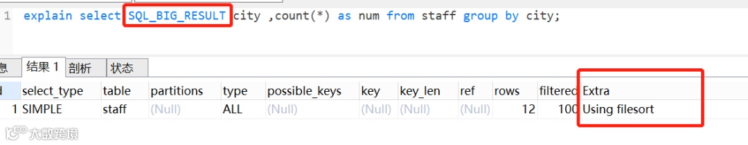 因此,如果预估数据量比较大,我们使用SQL_BIG_RESULT 这个提示直接用磁盘临时表。MySQl优化器发现,磁盘临时表是B+树存储,存储效率不如数组来得高。因此会直接用数组来存