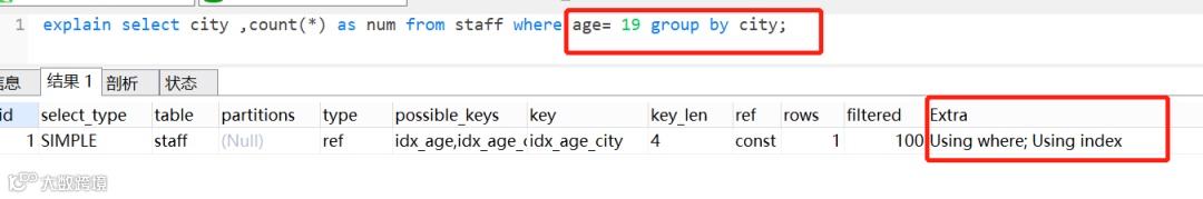 从explain 执行计划结果,可以发现查询条件命中了idx_age的索引,并且使用了临时表和排序