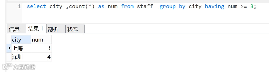 如果你要查询每个城市的员工数量,获取到员工数量不低于3的城市,having可以很好解决你的问题,SQL酱紫写: