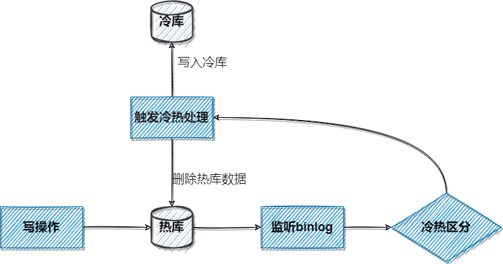 该种方案需要在业务代码层面判断是否需要冷热分离,比如订单的状态修改,一旦状态为终态则将这条数据标记为冷数据,然后触发冷热处理,将其写入冷库,同时删除热库中的这笔数据。