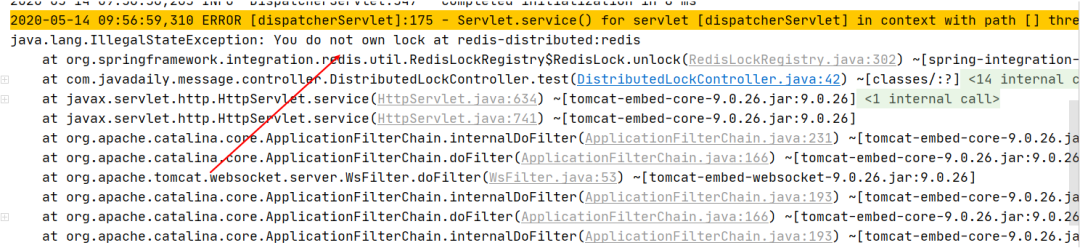 启动多个实例,分别访问/lock/redis端点,一个正常秩序业务逻辑,另外一个实例访问出现如下错误