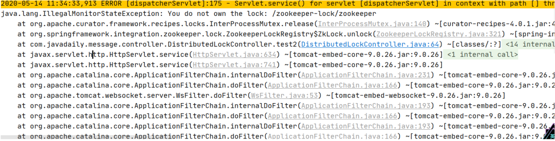 启动多个实例,分别访问/lock/zookeeper端点,一个正常秩序业务逻辑,另外一个实例访问出现如下错误