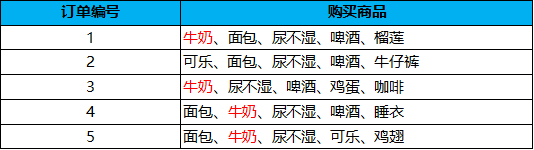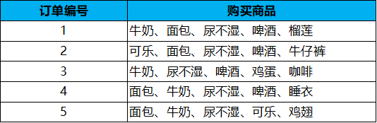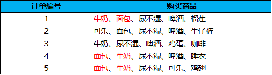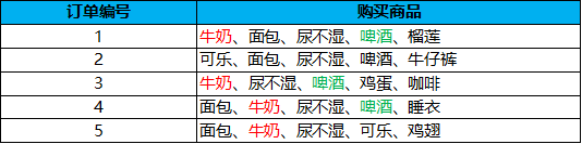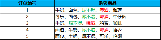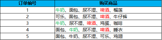 关联规则有三个核心概念需要理解:支持度、置信度、提升度,下面用最经典的啤酒-尿不湿案例给大家举例说明这三个概念,假如以下是几名客户购买订单的商品列表: