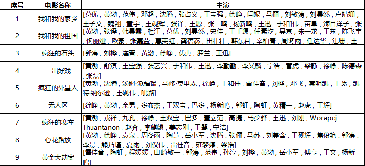 data = [['葛优','黄渤','范伟','邓超','沈腾','张占义','王宝强','徐峥','闫妮','马丽'],