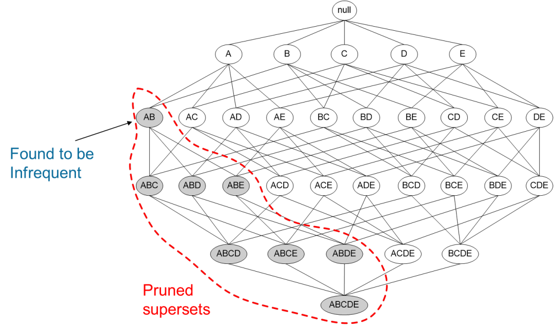 同理,如果下图所示,{A,B}这个项集是非频繁的,那虚线框后面的都不用计算了,运用Apriori算法的思想,我们就能去掉很多非频繁的项集,大大简化计算量,当然,面对大规模数据的时候,这种排除还是解决不了问题,于是还有FP-Growth(Frequent pattern Growth,频繁模式增长树)这种更高效的方法,后面有机会慢慢讲。