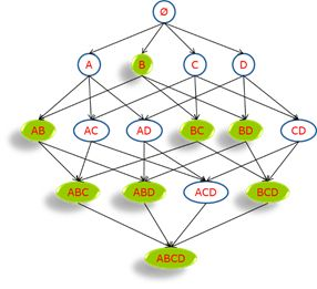 如下图,如果我们已知B不频繁,那么可以说图中所有绿色的项集都不频繁,搜索时就要这些项避开,减少计算开销。
