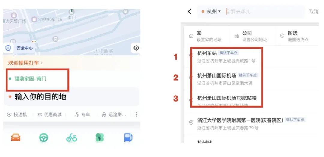 那当你每天早上打开软件的时候,打车软件就会推荐你的公司作为目的地,大大的减少用户的打车时间。如下图,我输入小区名称,马上给我推荐了三个地方,杭州东站第一位,因为平时的打车这个组合的支持度最高。