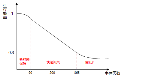 (2)3-12个月的用户流失速度较大(斜率大),此时所有用户都处于快速流失阶段;