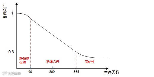 (1)0-3个月的用户处于对平台新鲜感保持的状态,此阶段用户的流失速度不大(斜率小) ;