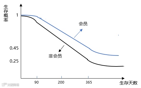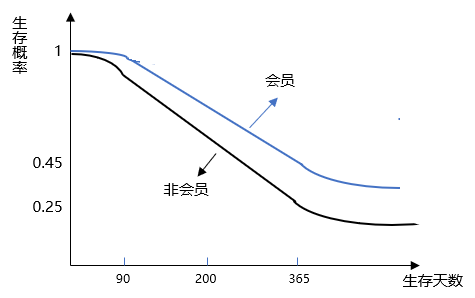 由上图可知:会员的生存曲线在非会员生存曲线之上,非会员用户更容易流失。从而可以针对不同类型用户的生存曲线,做对应的干预动作,实现精细化运营。