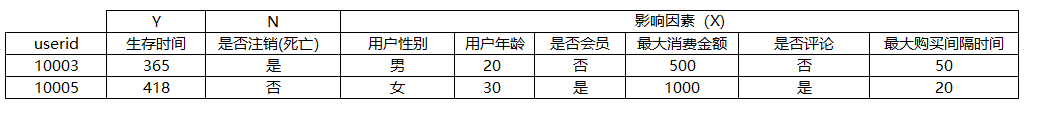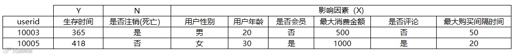 影响因素(X):影响用户生存时间长短的因素,比如性别、年龄、是否会员、最大消费金额、是否评论、最大购买间隔天数等