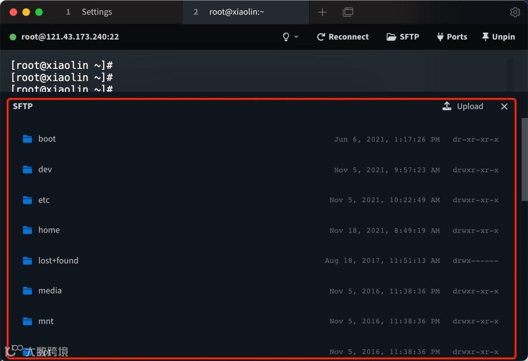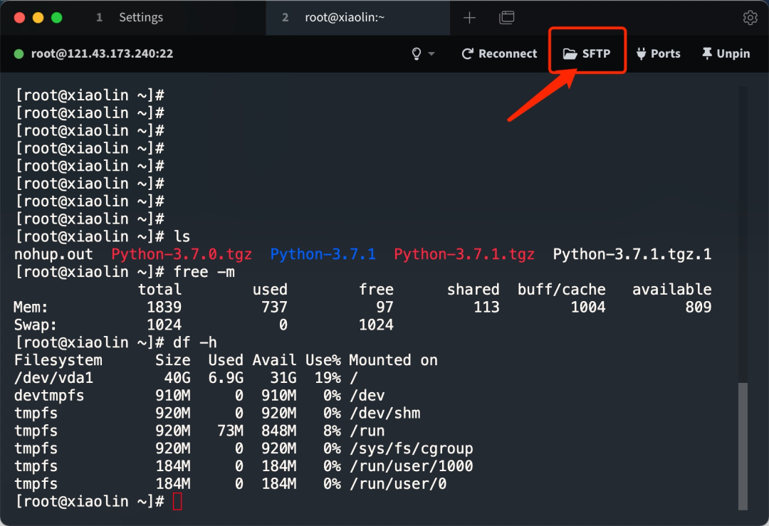 前面也介绍过,这款终端工具是自带 SFTP 功能的。要使用的话,直接点击下图中的 SFTP 图标就行。