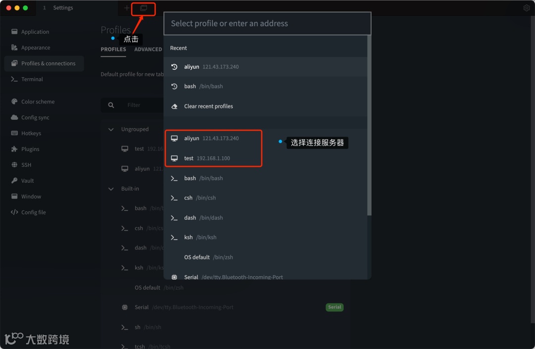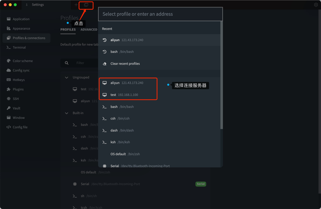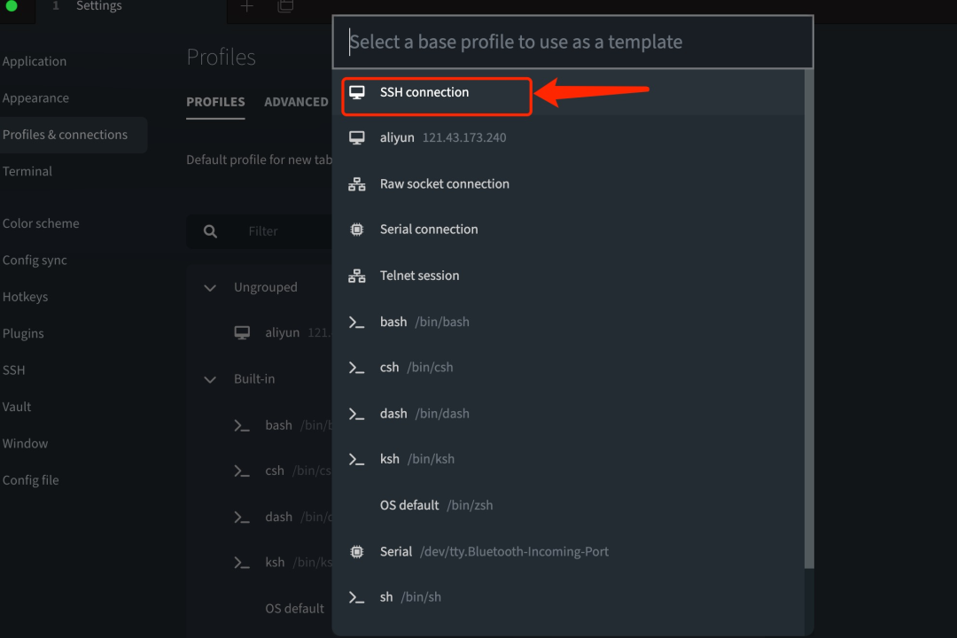 所以,要想新建一个连接服务器的终端,要点击「Settings」,进入到配置页面。