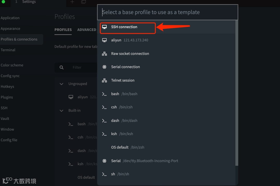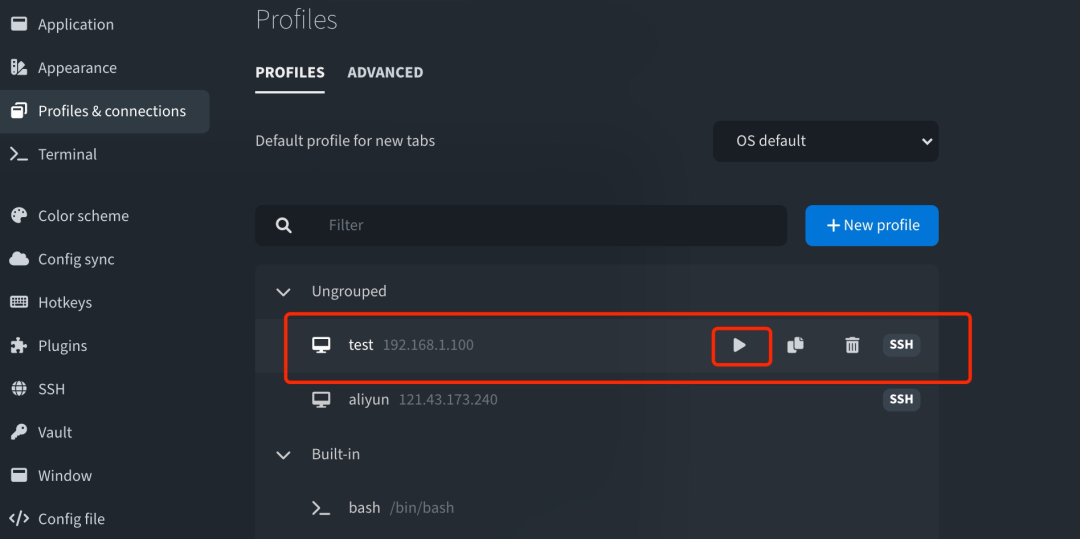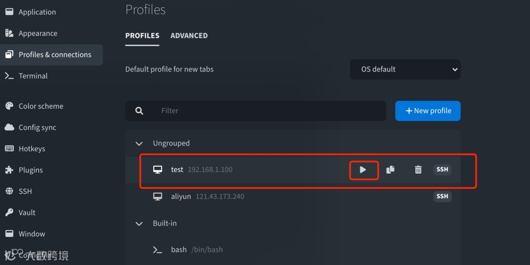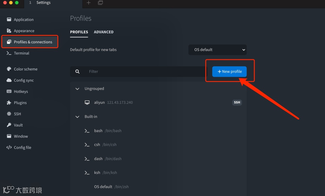 进入到设置页面后,选择 profiles&connections 这个选项,然后点击「New profile」新建一个终端配置。