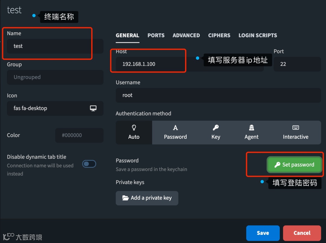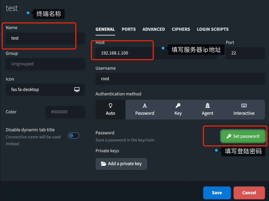 随后就会弹出配置 ssh 连接的信息,填上终端名称、IP 地址、端口号、账号密码就可以了。