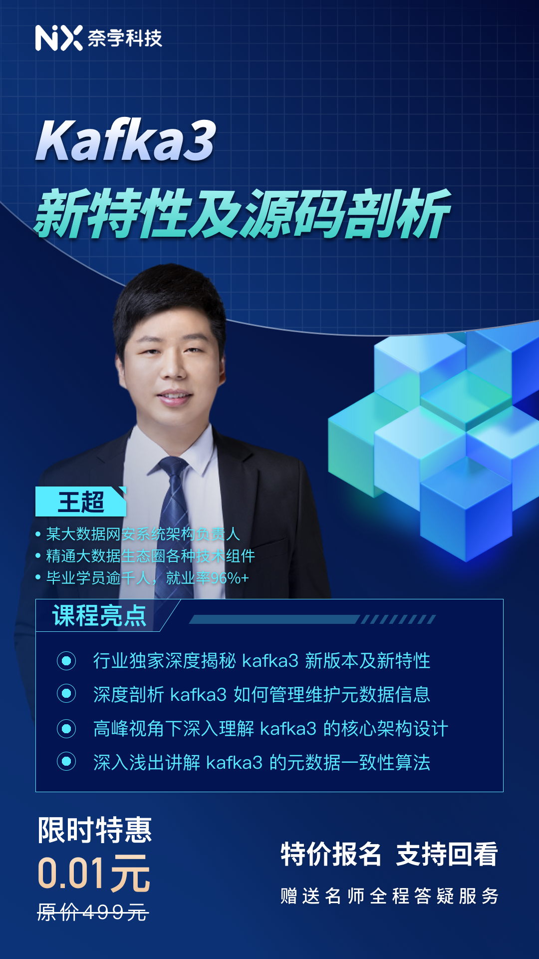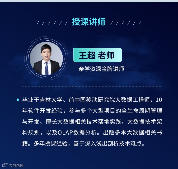 主讲王超老师,前中国移动研究院大数据工程师,拥有10年软件开发经验,参与多个大型项目的全生命周期管理与开发,擅长大数据相关技术落地实践、大数据技术架构规划以及OLAP数据分析,并且拥有多年的授课经验,善于深入浅出剖析技术难点。跟随王超老师学习Kafka3的新特性和源码,有问题可以在直播间和群里面随时提问,老师会帮你解答大数据、技术领域的核心问题。