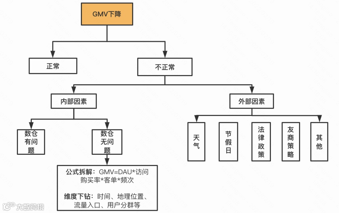 内部因素先判断是否基建问题,如果基建无问题,那么对GMV的公式:GMV=DAU*访问购买率*客单*频次进行拆解,看是哪一个指标出问题;
