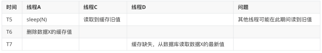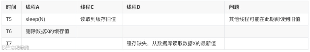 此外,还可以通过延时双删进行保障:在线程A更新完数据库值以后,让它先sleep一小段时间,确保线程B能够先从数据库读取数据,再把缺失的数据写入缓存,然后,线程A再进行删除。后续其它线程读取数据时,发现缓存缺失,会从数据库中读取最新值。