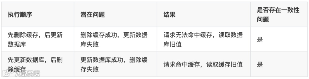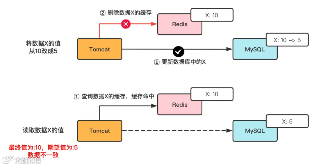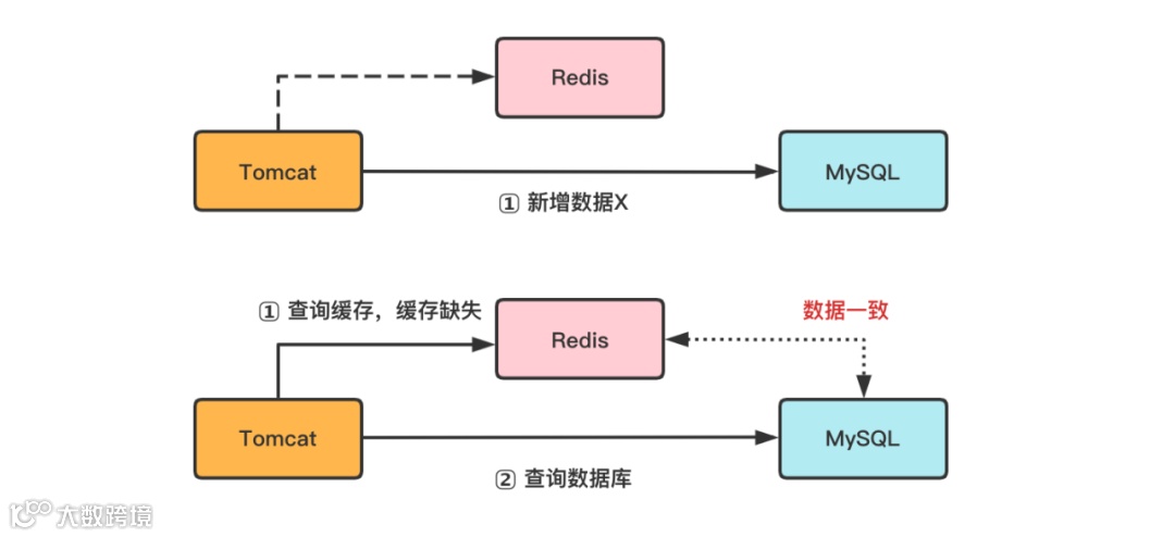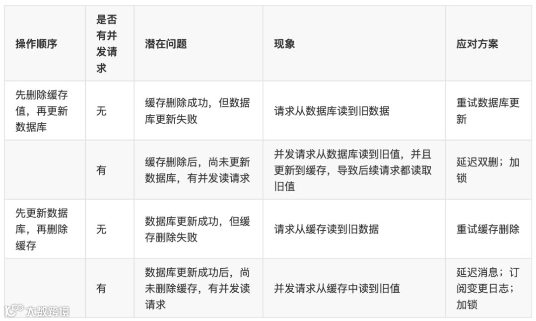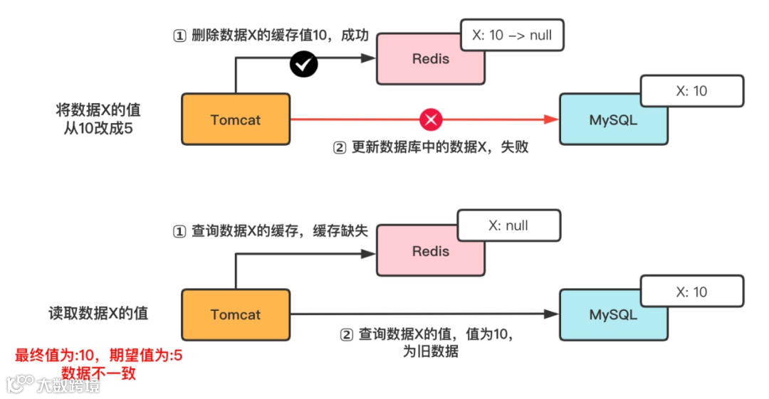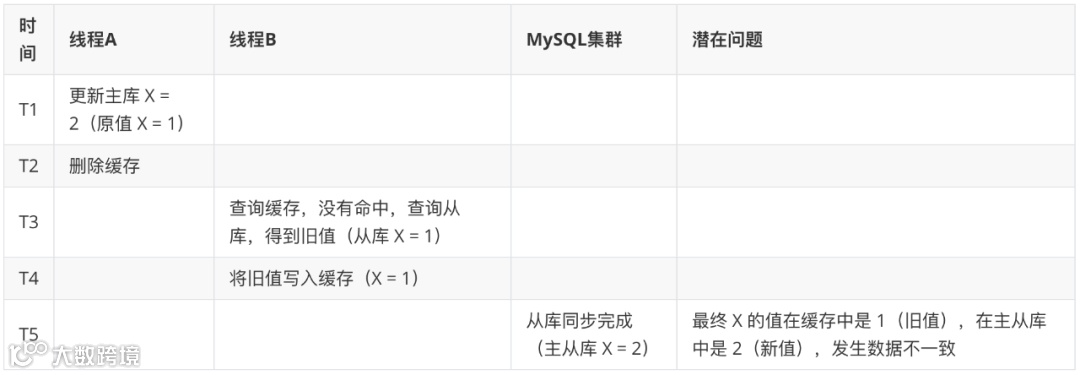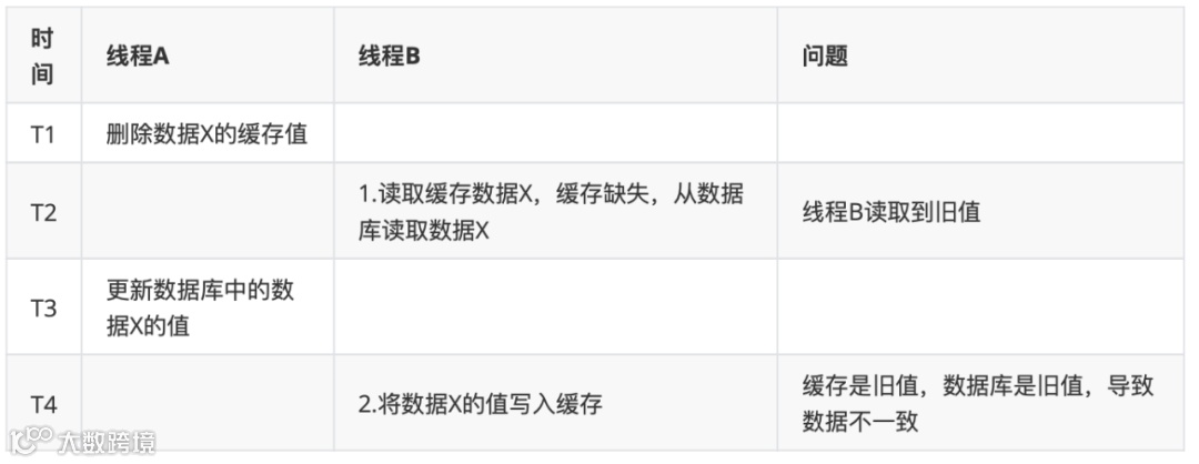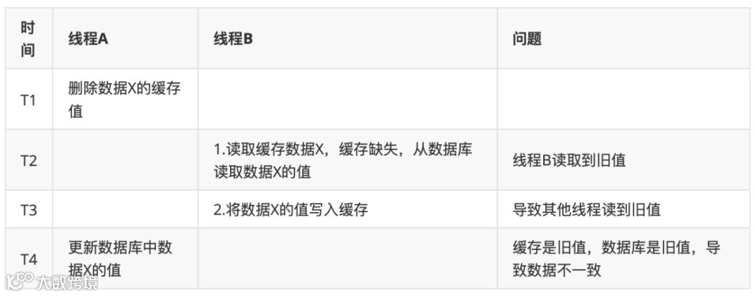 “数据不一致”:缓存的数据值≠数据库中的值;缓存或者数据库中存在旧值,导致其他线程读到旧数据。