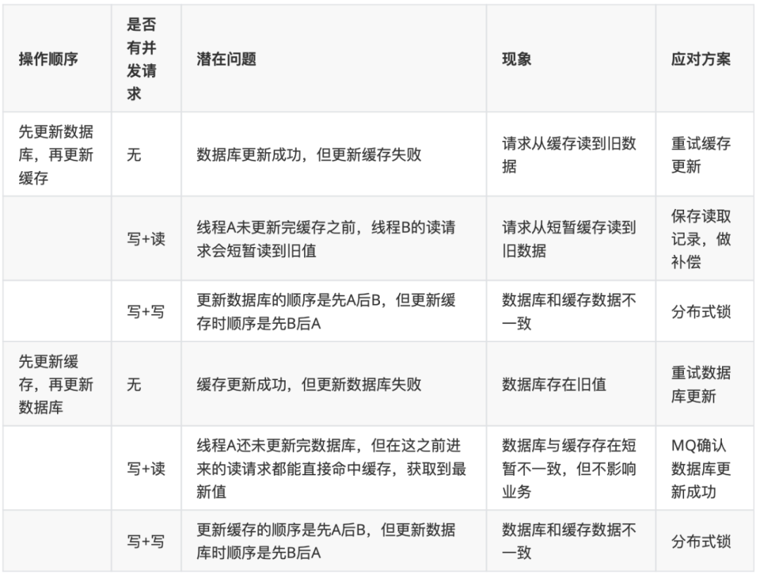 一致性:同步直写>异步回写,因此,对于读写缓存,要保持数据强一致性的主要思路是:利用同步直写,同步直写也存在两个操作的时序问题:更新数据库和更新缓存。