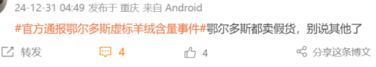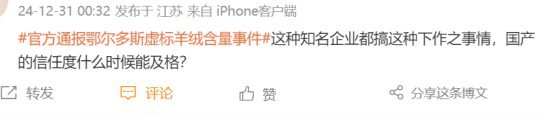 岁末年初,一条#官方通报鄂尔多斯虚标羊绒含量事件#的话题冲上热搜,网上诸多帖子留言对“鄂尔多斯”作为知名羊绒服装品牌却造假欺骗消费者的行为口诛笔伐。