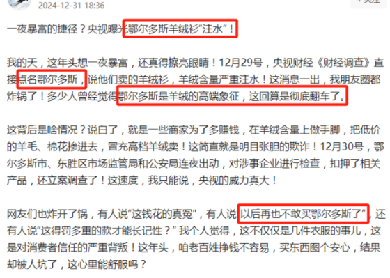 原来,12月29日晚,央视《财经调查》栏目报道了鄂尔多斯市有关羊绒制品经营主体销售虚标羊绒含量服装的情况。12月30日,鄂尔多斯市东胜区市场监督管理局发布情况通报,对相关涉事经营主体开展全面调查,对相关违法企业采取抽样检查、扣押等执法措施。不难看出,作为羊绒产品的世界知名品牌,“鄂尔多斯”显然是被误导为实施虚假宣传的不良商家了。