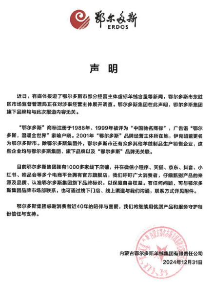鄂尔多斯集团公司紧急发布声明称,鄂尔多斯集团旗下品牌均与此次报道内容无关,并呼吁广大消费者,仔细甄别产品的来源及品质,认准鄂尔多斯集团旗下品牌标识,以保障自身权益。这究竟是怎么一回事呢?