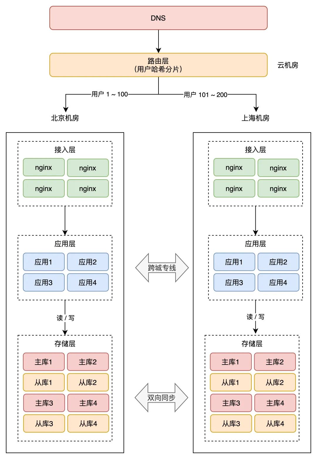 举例:一共 200 个用户,根据用户 ID 计算哈希值,然后根据路由规则,把用户 1 - 100 路由到北京机房,101 - 200 用户路由到上海机房,这样,就避免了同一个用户修改同一条数据的情况发生。