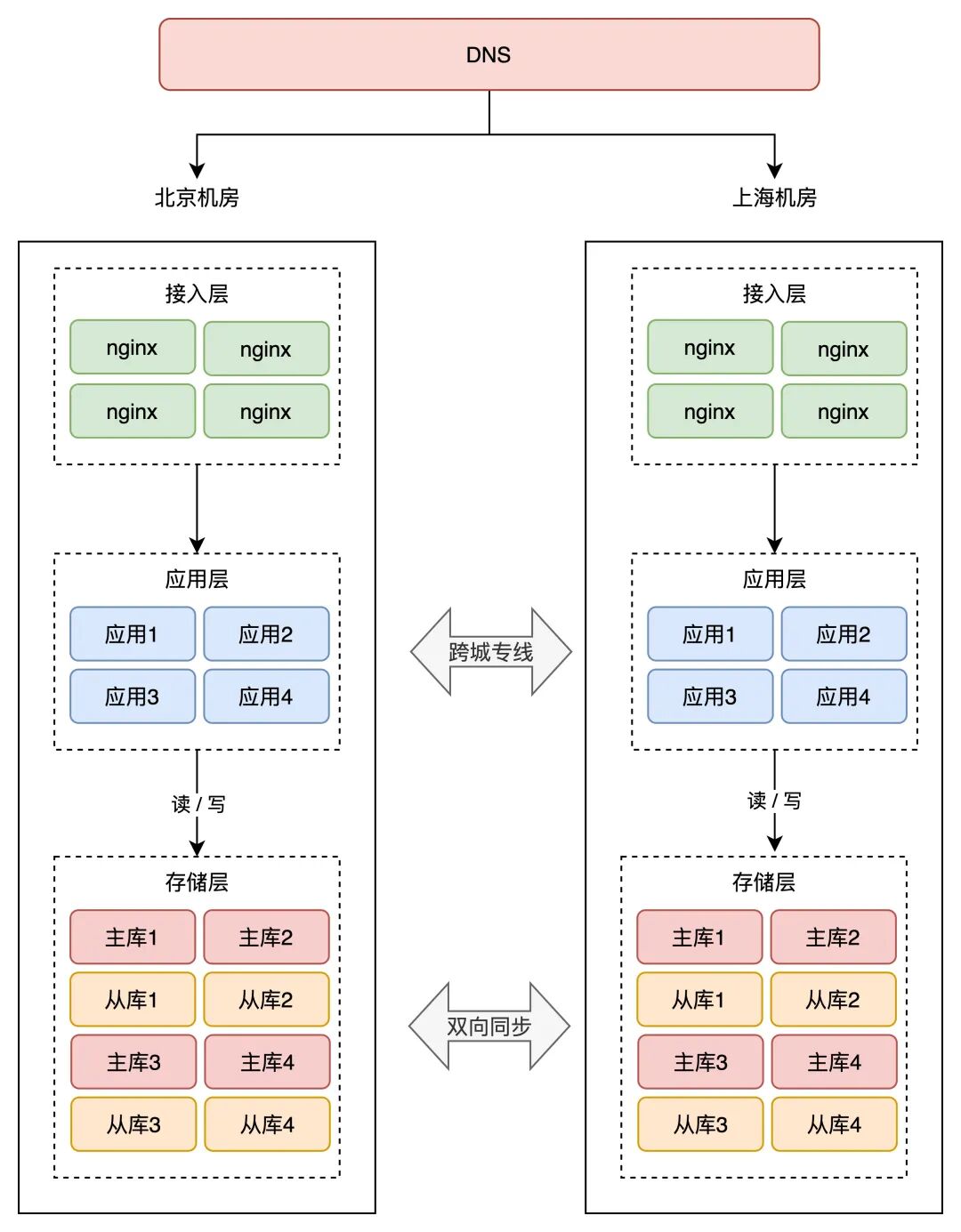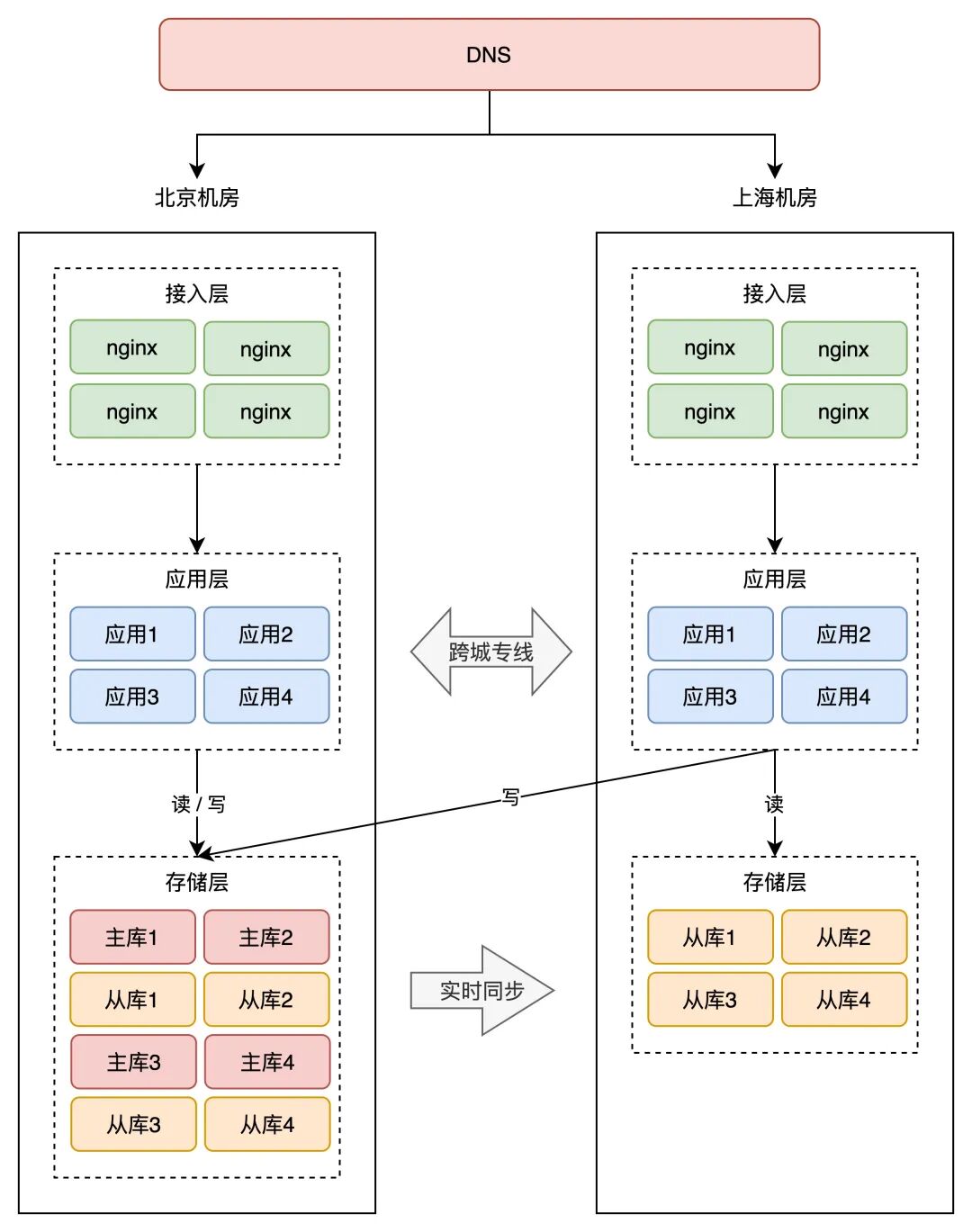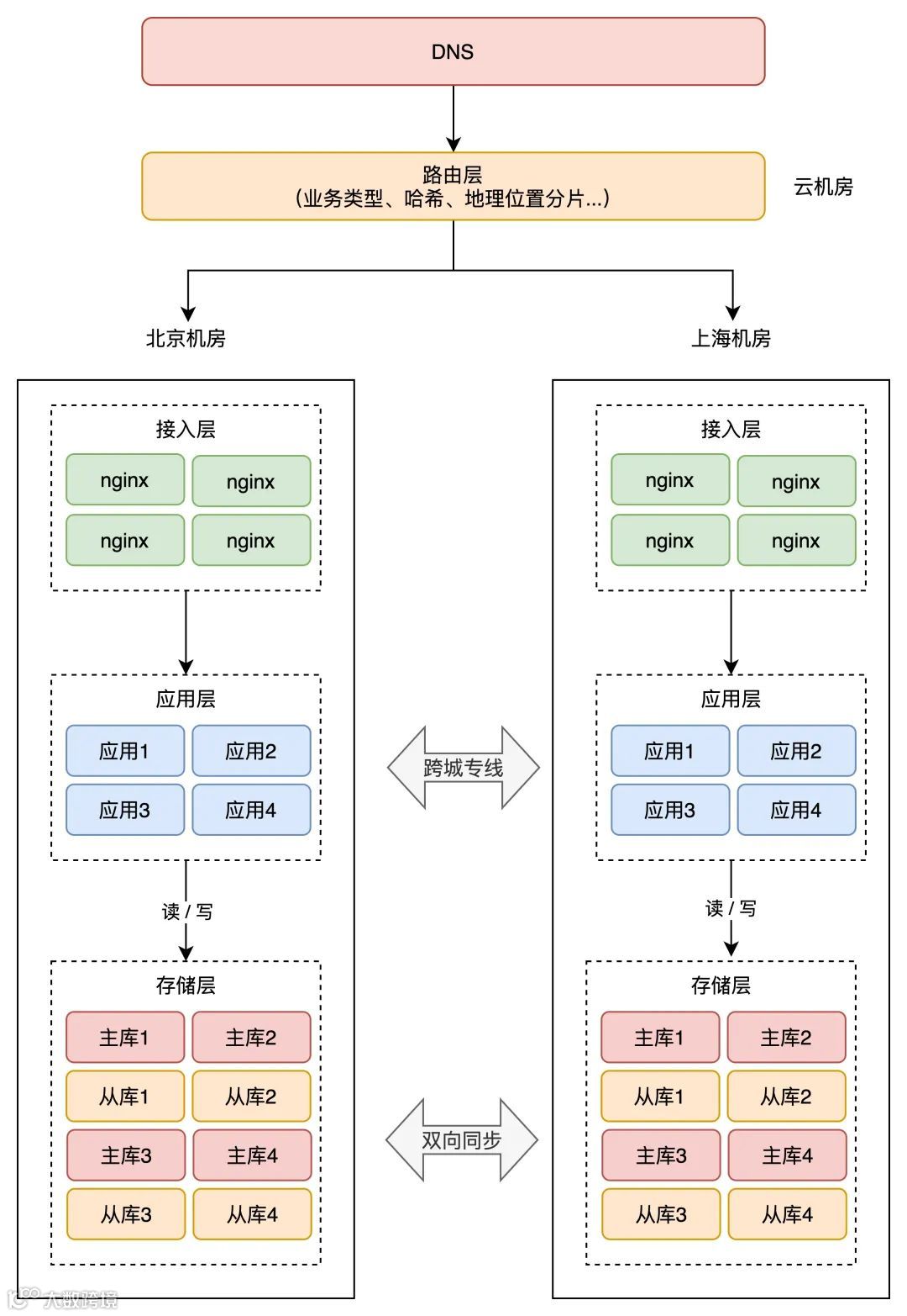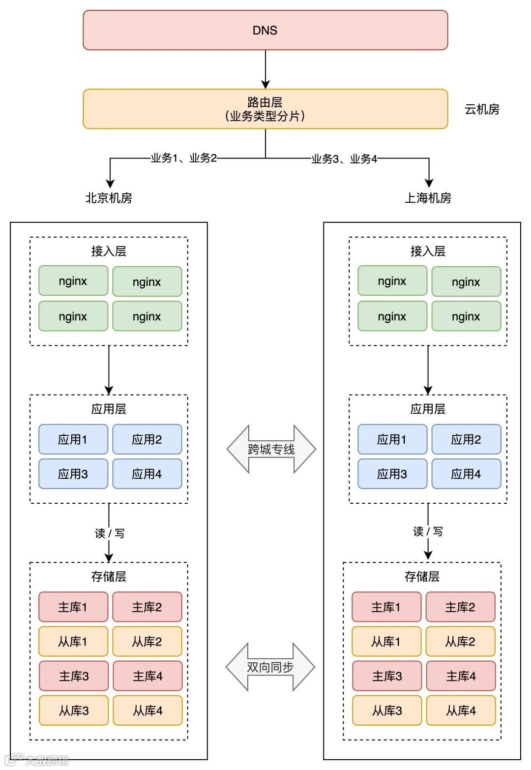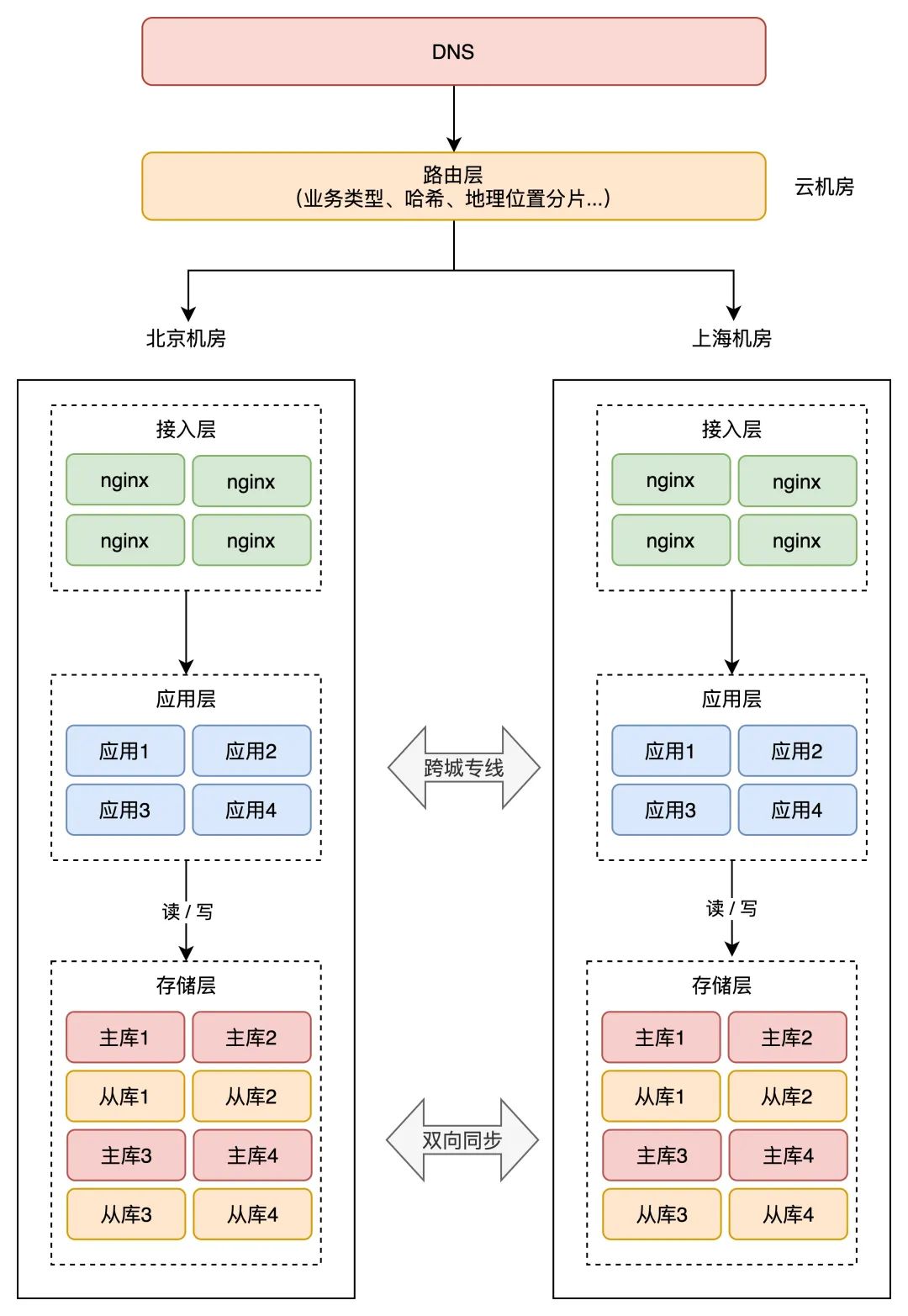 这样一来,应用 1、2 的所有业务请求,只读写北京机房存储,应用 3、4 的所有请求,只会读写上海机房存储。