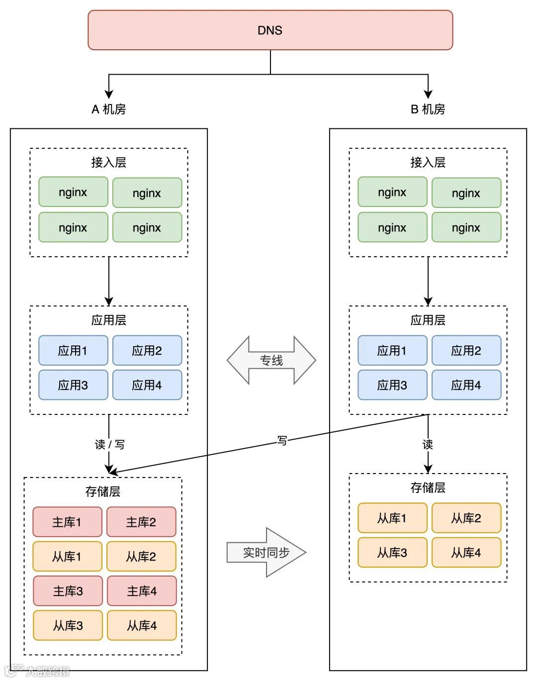 因此,要想缩短业务恢复的时间,你必须把这些工作在 B 机房「提前」做好,也就是说,你需要在 B 机房提前部署好接入层、业务应用,等待随时切换。架构就变成了这样: