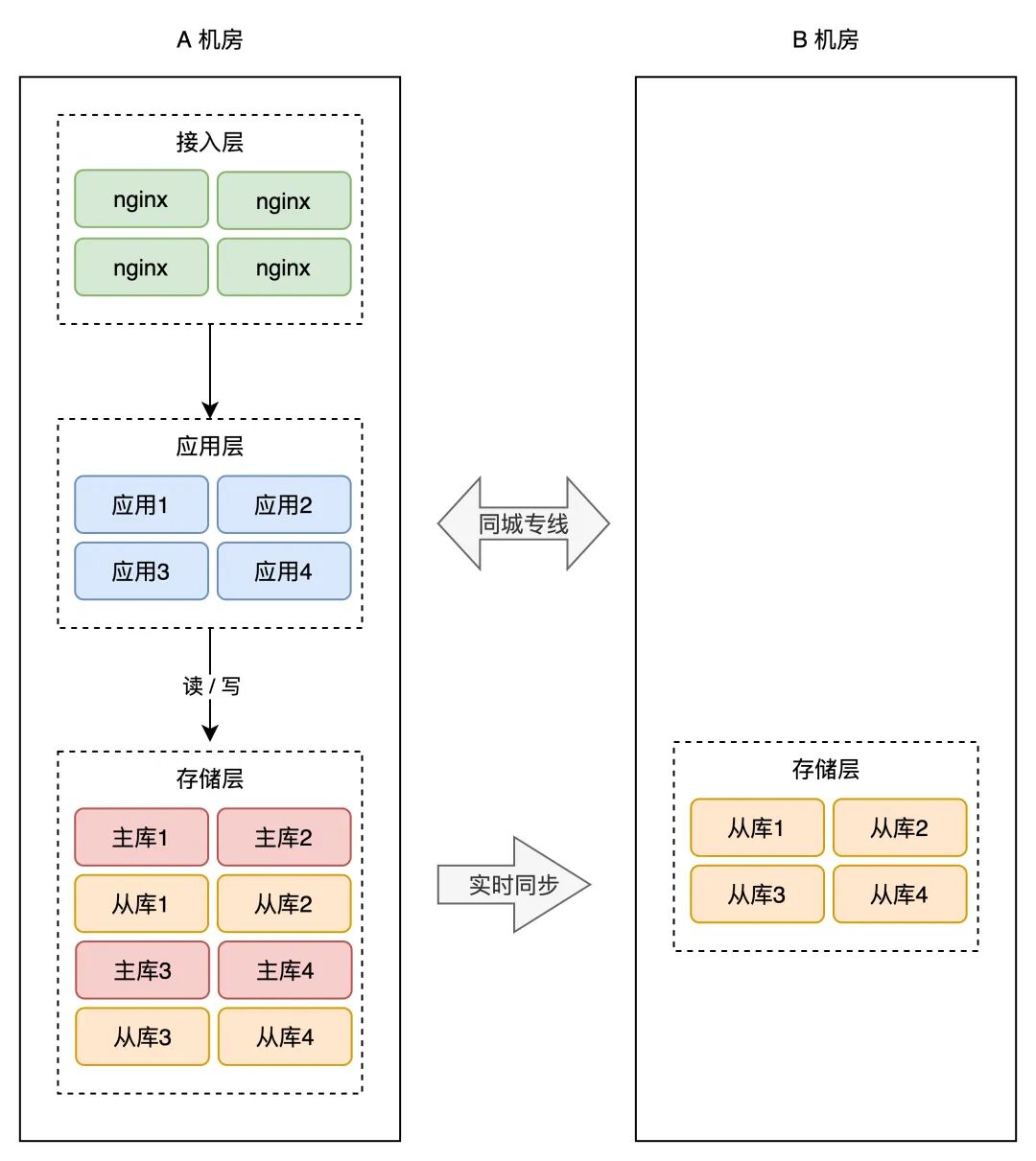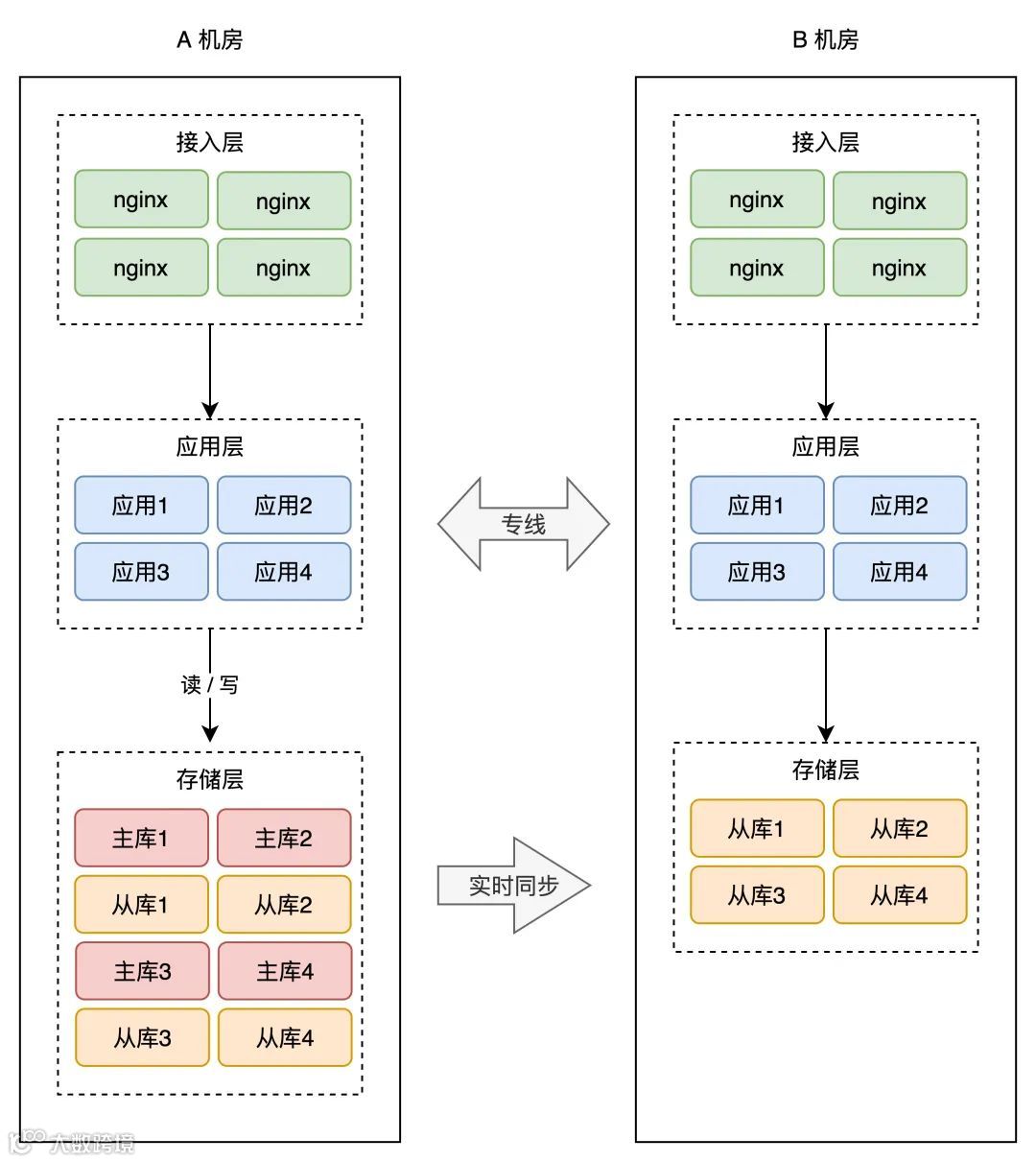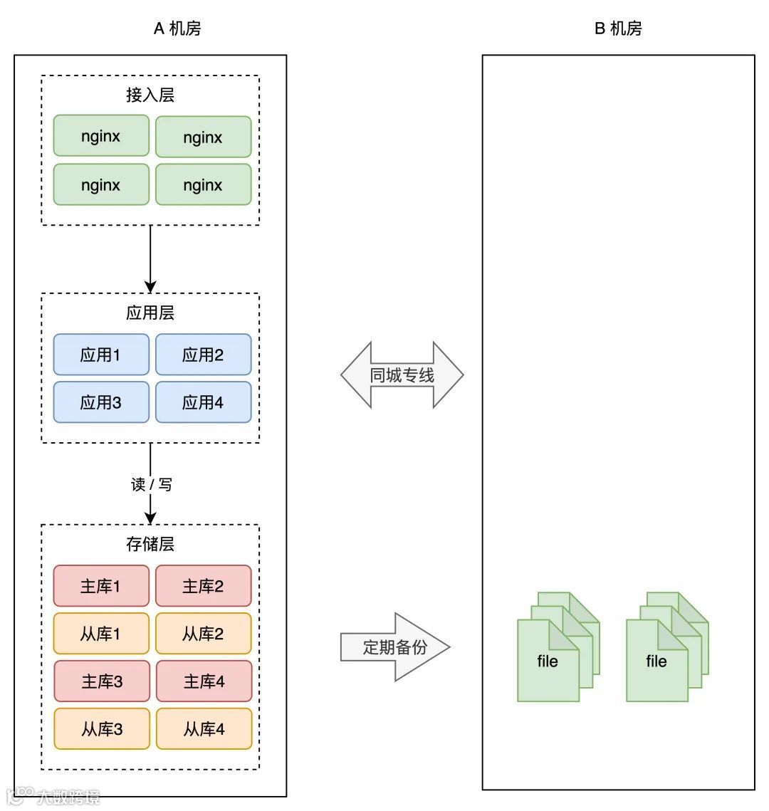 简单起见,你可以在「同一个城市」再搭建一个机房,原机房我们叫作 A 机房,新机房叫 B 机房,这两个机房的网络用一条「专线」连通。