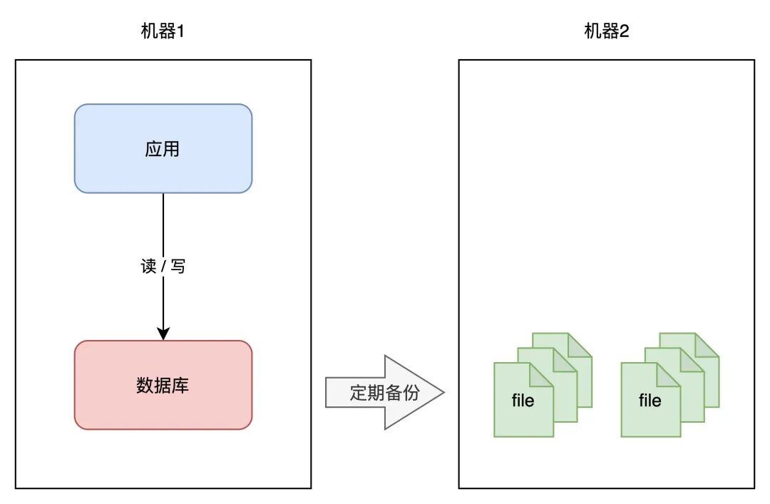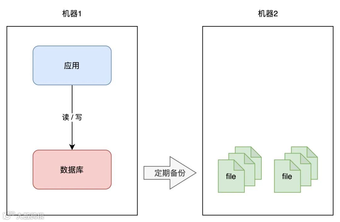 A 机房的数据,定时在 B 机房做备份(拷贝数据文件),这样即使整个 A 机房遭到严重的损坏,B 机房的数据不会丢,通过备份可以把数据「恢复」回来,重启服务。