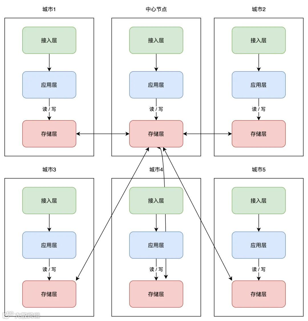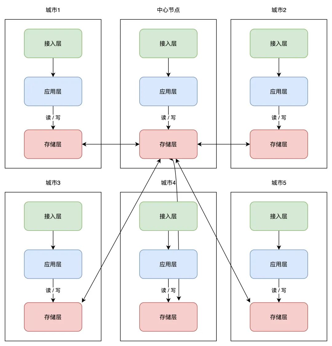 这样做的好处是,一个机房写入数据,只需要同步数据到中心机房即可,不需要再关心一共部署了多少个机房,实现复杂度大大「简化」。