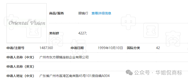 广州东方眼镜公司于1999年在“眼镜行”服务上申请了“ORIENTAL VISION”英文商标。
