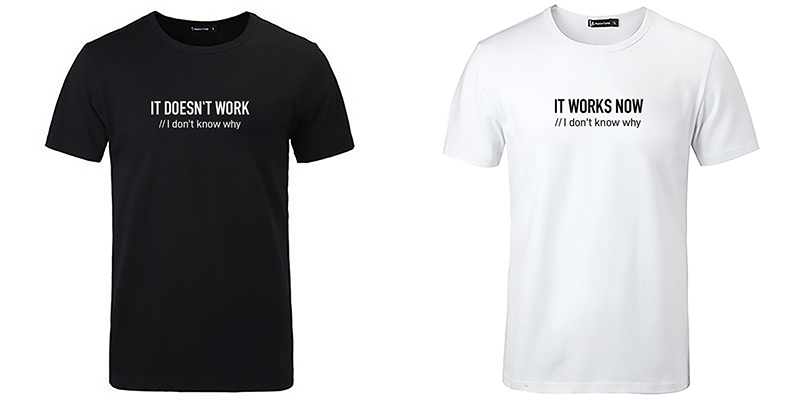 跟老公都是程序员,然后给老公买了两件,跟同事又拼了两件,同事和老公都觉得质量不错,是纯棉的,洗过了之后也不错没有掉色等等问题,图案印花也很好,清晰,快递很给力,总之就是物有所值好,大家可以放心购买咯!