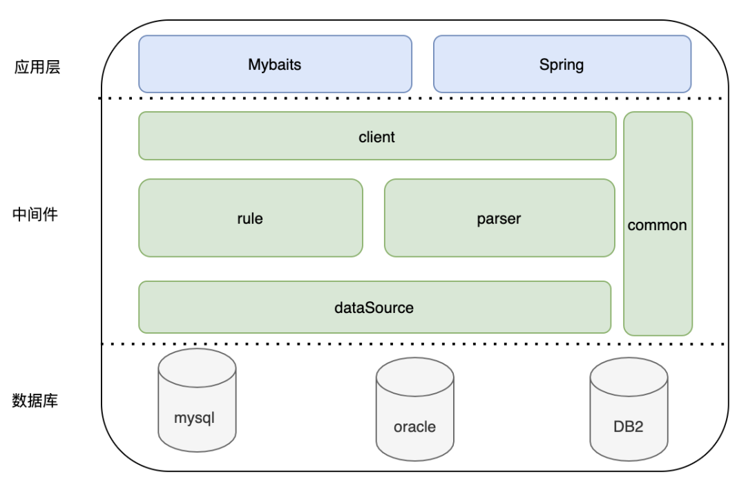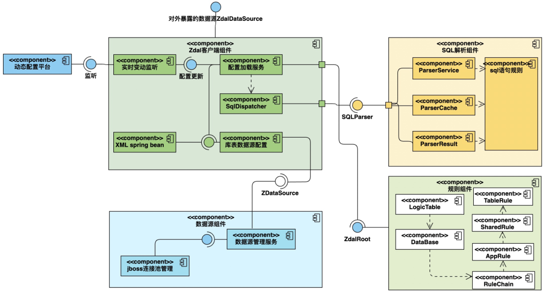 Client包对应用层暴露的数据源、负责监听配置动态变更的监听组件、负责加载组织各部分的配置组件、负责加载spring bean 和库表规则的配置组件; -