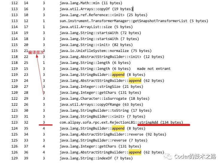 我们看到,随着代码的执行次数的增加,一些方法,进行了C1编译,如我们的主方法stringAdd,而少数方法,从C1编译提升到了C2编译,如AbstractStringBuilder::append方法。