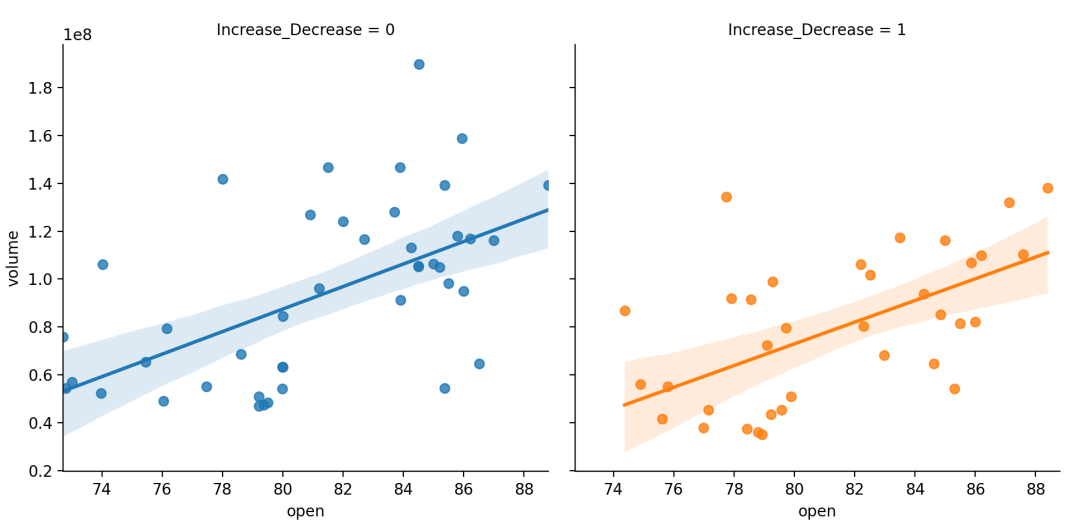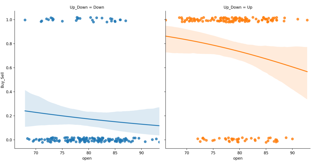 g = sns.lmplot(x= "open", y= "Buy_Sell", col= "Up_Down", hue= "Up_Down",