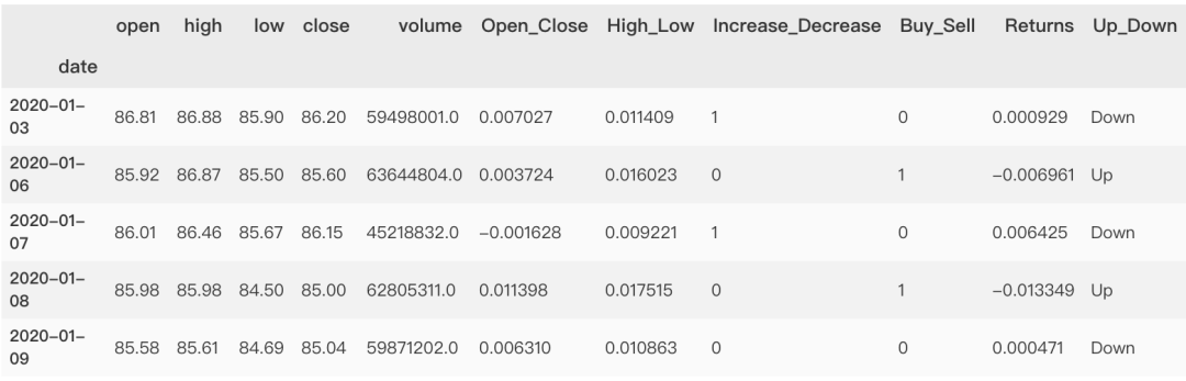 dataset['Up_Down'] = np.where(dataset['Returns'].shift(-1) > dataset['Returns'],'Up','Down')