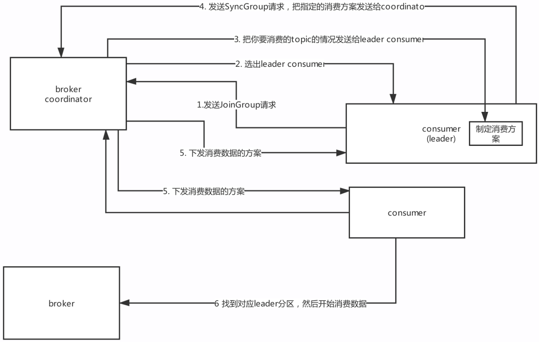 运行流程 1)每个consumer都发送JoinGroup请求到Coordinator, 2)然后Coordinator从一个consumer group中选择一个consumer作为leader, 3)把consumer group情况发送给这个leader, 4)接着这个leader会负责制定消费方案, 5)通过SyncGroup发给Coordinator 6)接着Coordinator就把消费方案下发给各个consumer,他们会从指定的分区的 leader broker开始进行socket连接以及消费消息