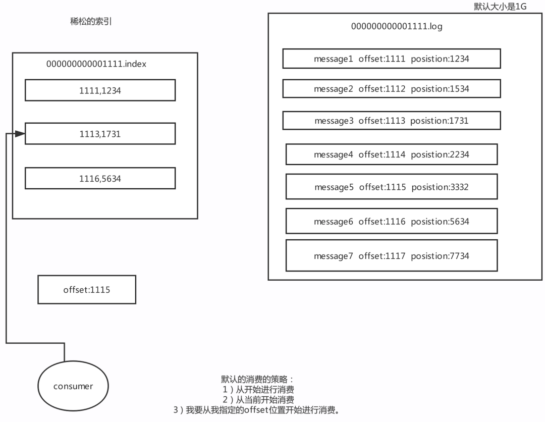 Kafka里面每一条消息,都有自己的offset(相对偏移量),存在物理磁盘上面,在position Position:物理位置(磁盘上面哪个地方)也就是说一条消息就有两个位置:offset:相对偏移量(相对位置)position:磁盘物理位置稀疏索引: Kafka中采用了稀疏索引的方式读取索引,kafka每当写入了4k大小的日志(.log),就往index里写入一个记录索引。其中会采用二分查找