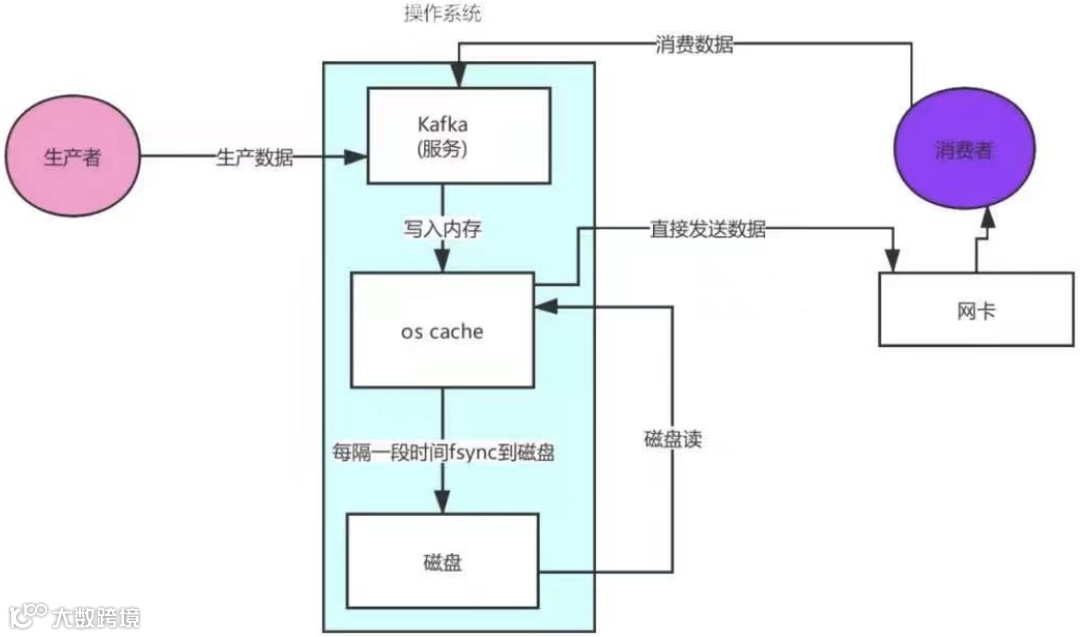 1.消费者发送请求给kafka服务 2.kafka服务去os cache缓存读取数据(缓存没有就去磁盘读取数据) 3.从磁盘读取了数据到os cache缓存中 4.os cache直接将数据发送给网卡 5.通过网卡将数据传输给消费者