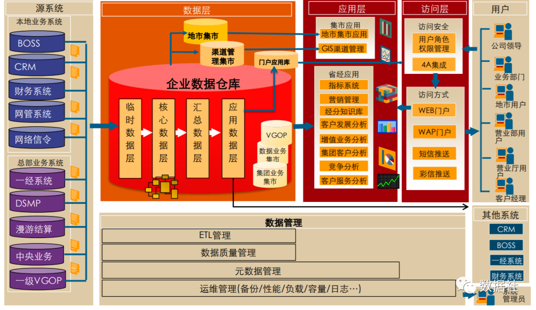 数据仓库:数据仓库系统的主要应用主要是OLAP(On-Line Analytical Processing),支持复杂的分析操作,侧重决策支持,并且提供直观易懂的查询结果。也就是说,数据仓库汇总有可能有很多维度数据的统计分析结果,取百家之长(各个数据源的数据),成就自己的一方天地(规划各种业务域的模型,指标)。