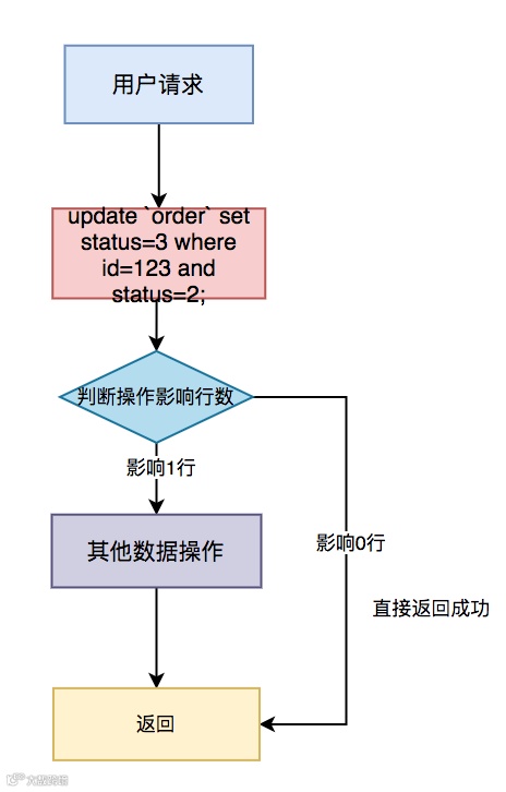 后面有相同的请求过来,再执行相同的sql时,由于订单状态变成了3,再用status=2作为条件,无法查询出需要更新的数据,所以最终sql执行结果的影响行数是0,即不会真正的更新数据。但为了保证接口幂等性,影响行数是0时,接口也可以直接返回成功。