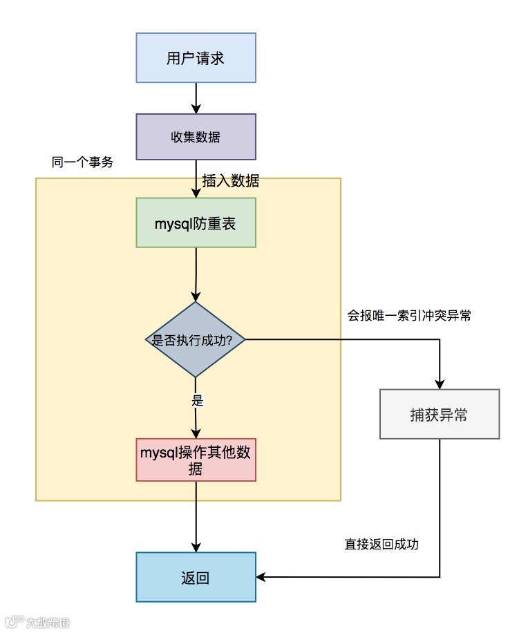 如果执行失败,捕获唯一索引冲突异常,直接返回成功。
