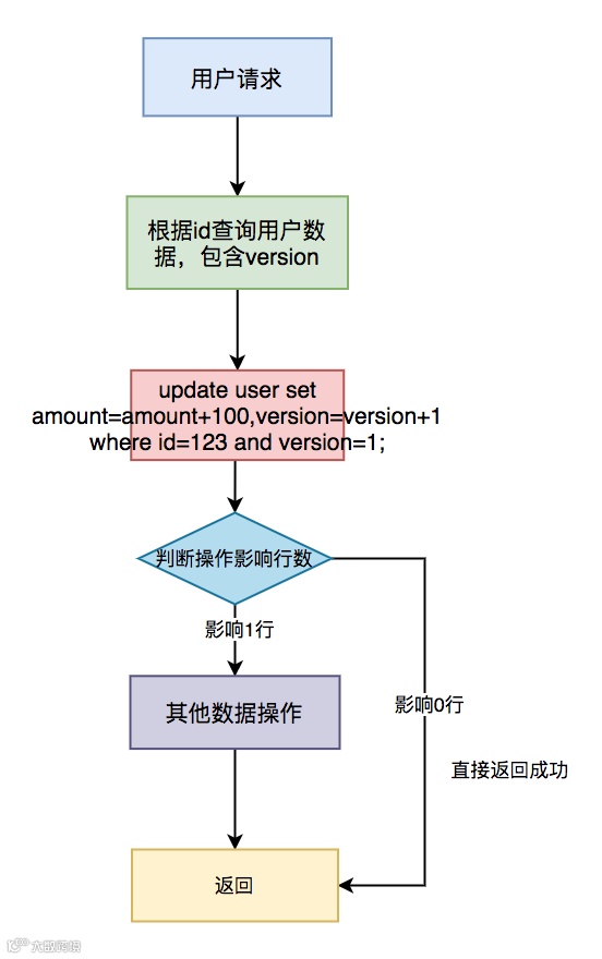 update user set amount=amount+100,version=version+1where id=123 and version=1;