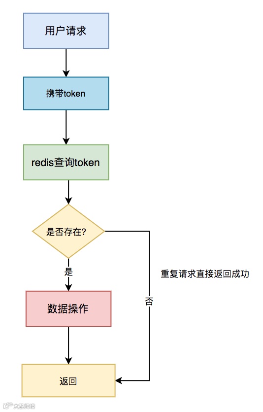 在redis中查询该token是否存在,如果不存在,说明是第一次请求,做则后续的数据操作。 -