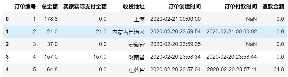 f. 订单付款时间:付款时间(如果未付款,显示NaN)